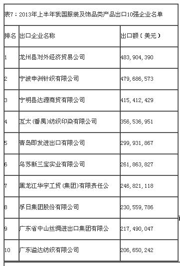 從出口企業(yè)情況來看,我國服裝及飾品類產(chǎn)品出口集中度與紡織原料類產(chǎn)品相比更為分散,出口額排名前10位企業(yè)出口額合計(jì)僅占同期出口總額的3.5%,今年第一季度出口10強(qiáng)企業(yè)名單如表7: