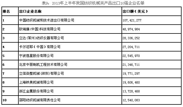表8:2013年上半年我國紡織機械類產(chǎn)品出口額排名前10位品種出口情況