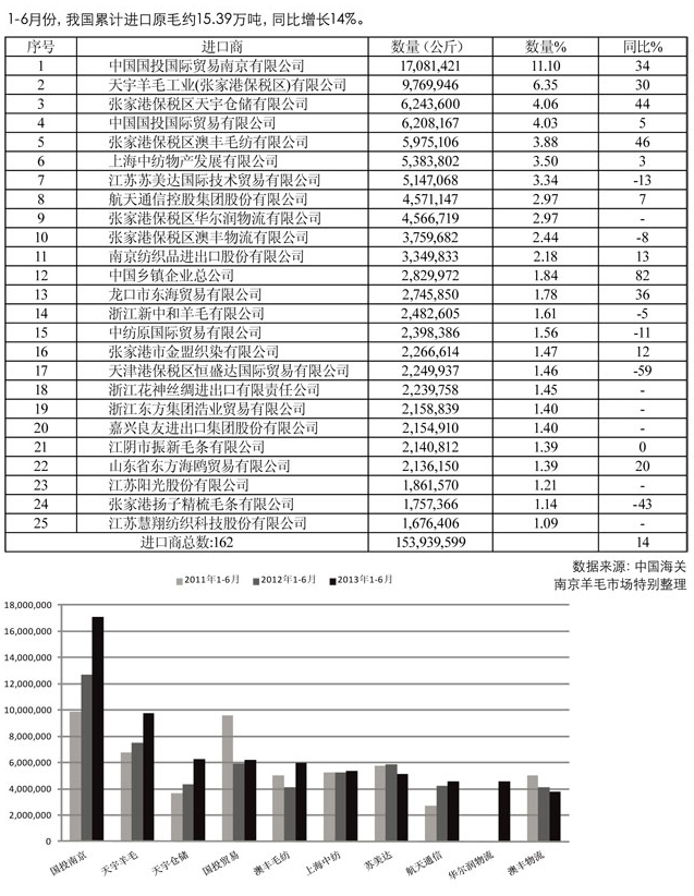 錦橋紡織網(wǎng)—資訊頻道> 外貿(mào)信息>正文 2013年1-6月份我國進口原毛前25家企業(yè)