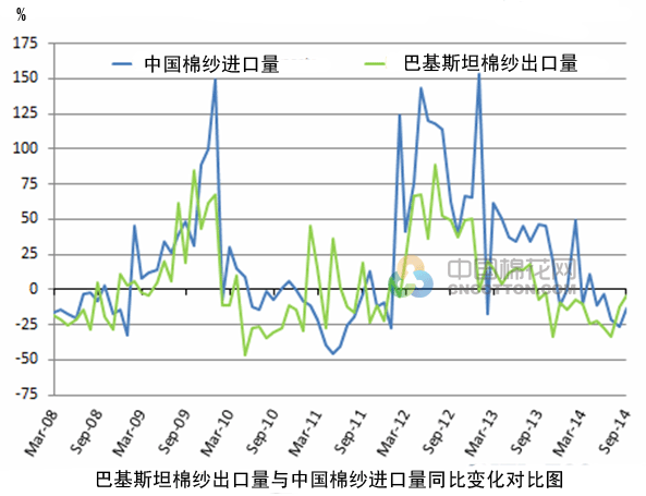 隨著棉紗月出口量持續(xù)下滑,2014年巴基斯坦棉紗出口量將難以實(shí)現(xiàn)突破。今年1-9月,巴基斯坦棉紗累計(jì)出口87萬(wàn)噸,同比減少16.9%,為三年來(lái)最低水平。照這個(gè)趨勢(shì)發(fā)展,巴基斯坦棉花消費(fèi)前景非常不妙。