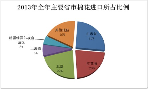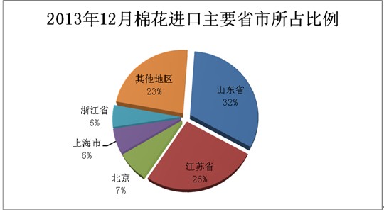 按照進口棉花的地區(qū)來看(見圖4),2013年12月中國進口棉花的地區(qū)主要集中在山東、江蘇、北京、上海和浙江等地。本月山東進口棉花居全國省份首位,最為傳統(tǒng)的棉紡大省,較上月大幅增加,為19.42萬噸,環(huán)比增加287%,占進口總量的31.9%。江蘇本月進口棉花為16.03萬噸,環(huán)比增加211.3%,為第二大進口省市。北京進口棉花為4.29萬噸,比上月的2.24萬噸增加91.5%。上海12月份進口棉花為3.73萬噸,比上月增加448.5%。浙江進口棉花為3.27萬噸,比上月增加2.38萬噸,環(huán)比上漲267.4%。2013年12月排在前十位的進口地區(qū)還包括廣東、新疆、河北、河南以及福建省。
