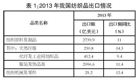 據(jù)海關(guān)信息網(wǎng)數(shù)據(jù)顯示,2013年我國(guó)共出口紡織原料及制品2739.9億美元,比上一年同期增長(zhǎng)11%。其中,天然纖維類產(chǎn)品出口230.8億美元,比上一年同期增長(zhǎng)14.3%;化纖及工業(yè)用紡織品類產(chǎn)品出口412.4億美元,比上一年同期增長(zhǎng)9.4%;服裝及飾品類產(chǎn)品出口2096.6億美元,比上一年同期增長(zhǎng)11.4%。另外,2013年我國(guó)紡織機(jī)械產(chǎn)品出口額為25.2億美元,比上一年同期增長(zhǎng)12.4%。(詳見(jiàn)表1)