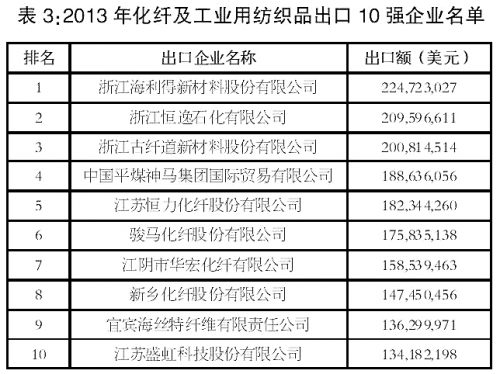 從出口企業(yè)情況來(lái)看,我國(guó)化纖及工業(yè)用紡織產(chǎn)品出口集中度較低,出口額排名前10位企業(yè)出口額合計(jì)僅占同期出口總額的4.3%。(詳見(jiàn)表3)