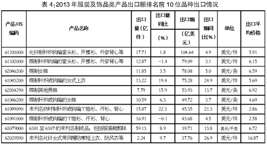 從出口主要品種來(lái)看,主要以棉質(zhì)類服裝為主。2013年出口額超10億美元的品種共有8種。(詳見(jiàn)表4)