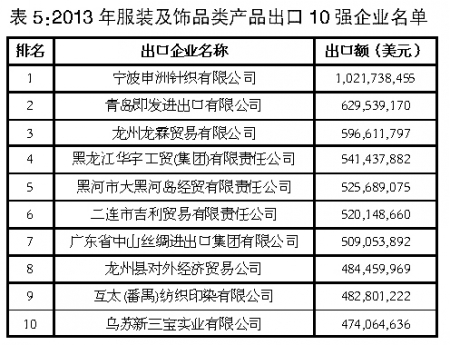 從出口企業(yè)情況看,我國(guó)服裝及飾品類產(chǎn)品出口集中度與紡織原料類產(chǎn)品相比更為分散,出口額排名前10位企業(yè)出口額合計(jì)僅占同期出口總額的2.6%。(詳見(jiàn)表5)