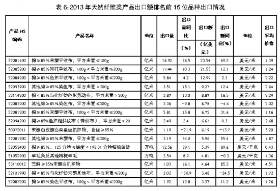 從天然纖維類產(chǎn)品出口主要品種看,各類型棉織布品種出口額排名居前。(詳見(jiàn)表6)