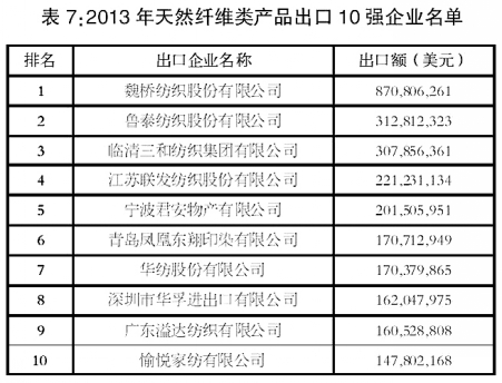 從出口企業(yè)情況來(lái)看,我國(guó)天然纖維類產(chǎn)品出口集中度較低,出口額排名前10位企業(yè)出口額合計(jì)占同期出口總額的11.8%。(詳見(jiàn)表7)