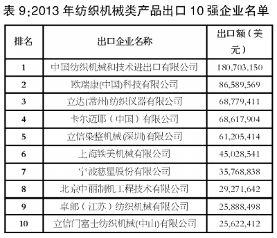 從出口企業(yè)情況來(lái)看,我國(guó)紡織機(jī)械類產(chǎn)品出口集中度相對(duì)較高,出口額排名前10位企業(yè)出口額合計(jì)占同期我國(guó)紡織機(jī)械類產(chǎn)品出口總額的24.9%。(詳見(jiàn)表9)