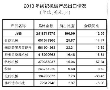 近三年的出口數(shù)據(jù)表明,我國針織設(shè)備、棉紡設(shè)備、印染設(shè)備的出口均呈現(xiàn)出不斷增長的趨勢。2013年針織機械出口額為6.52億美元,同比增長14.47%,占比26.37%,位居第一。除針織機械外,紡機出口總額排在前幾位的依次為輔助裝置及零配件、印染后整理機械、紡紗機械、織造機械、化纖機械、非織造布機械。除化纖機械和非織造布機械出口額為負增長外,其余紡機設(shè)備出口總額均為正增長。