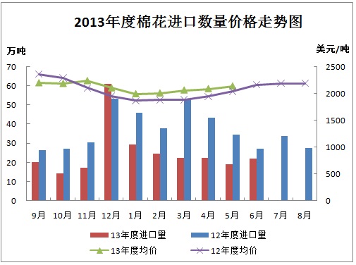 據(jù)海關(guān)統(tǒng)計(jì),2014年6月我國(guó)進(jìn)口棉花21.82萬(wàn)噸,較上月增加2.67萬(wàn)噸,增幅13.9%,同比減少19.1%;平均進(jìn)口價(jià)格2132美元/噸,較5月下跌5美元,跌幅0.2%,同比下跌1.3%。2013年度前10個(gè)月累計(jì)進(jìn)口251.9萬(wàn)噸,同比減少33.4%。2014年前6個(gè)月共進(jìn)口139.48萬(wàn)噸,同比下降42.2%。