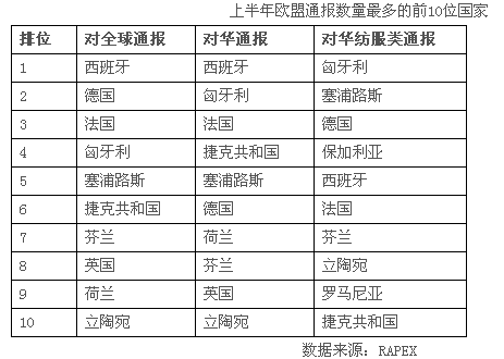 今年上半年對華發(fā)出通報最多的依然是西班牙,達110起(去年全年的通報數(shù)是172起)。匈牙利、法國、捷克共和國、塞浦路斯分別排名前5位。對華發(fā)出通報數(shù)最多的10個國家共發(fā)出551起通報,占全部對華通報總數(shù)的82.2%。