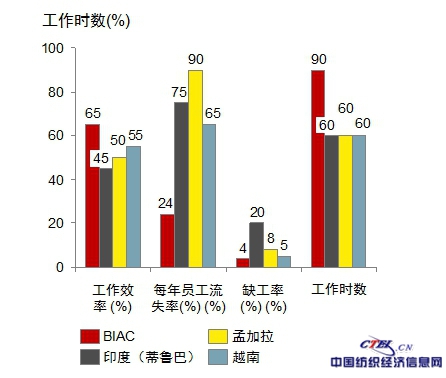 在員工效率方面,印度境內(nèi)不同紡織園區(qū)之間也存在差別,通常情況下,成熟園區(qū)的員工在工作效率、員工流失率、缺工率和工作時數(shù)方面都具有明顯的優(yōu)勢,例如,布蘭迪克(BIAC)園區(qū)不論與國內(nèi)其他園區(qū)還是與東南亞部分國家相比,員工的工作效率和工作時數(shù)都較高,而每年的員工流失率、缺工率相比則低很多。