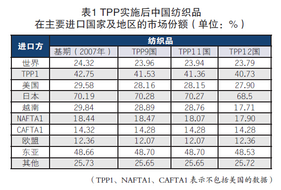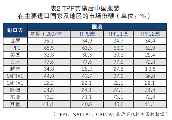 不能否認(rèn),習(xí)慣于制定國際規(guī)則和世界秩序的人,在MFA這么一個不公平的規(guī)則解除之后,仍想著重新掌握全球貿(mào)易的話語權(quán)與控制權(quán),他們也確實(shí)具有這方面的能力。經(jīng)濟(jì)專業(yè)人士陸圣2013年在分析TPP進(jìn)程階段中的紡織服裝的市場占有率的變化時,發(fā)現(xiàn)中國的紡織服裝在相關(guān)市場占有率出現(xiàn)下降(表1、表2),可以預(yù)期,當(dāng)TPP12國協(xié)議正式付諸實(shí)施,紡織貿(mào)易轉(zhuǎn)移效應(yīng)會進(jìn)一步顯現(xiàn),這需要中國的紡織界特別是學(xué)術(shù)界認(rèn)真分析并拭目以待。