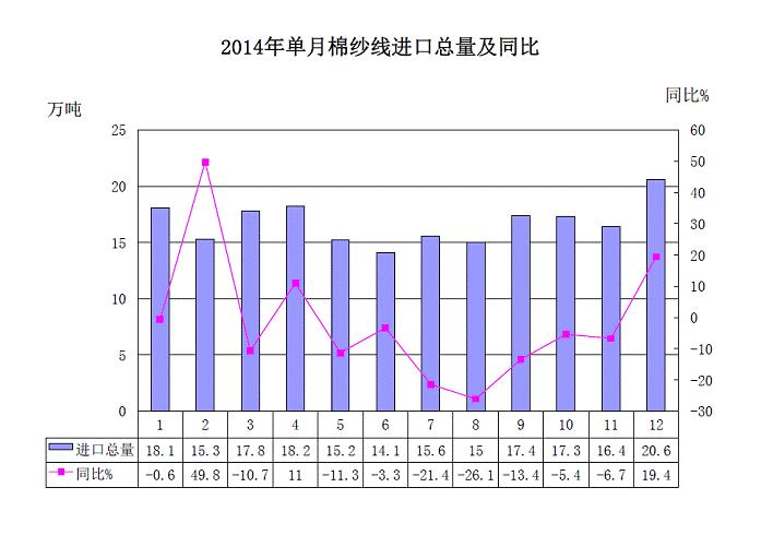 一、2014年我國(guó)棉紗線進(jìn)口較去年回落。