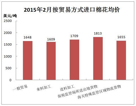 2月份,受春節(jié)因素影響,紡織企業(yè)采購(gòu)棉花較為清淡,我國(guó)棉花進(jìn)口數(shù)量、平均價(jià)格環(huán)比相對(duì)平穩(wěn),但同比均持續(xù)下降。配額使用以1%關(guān)稅為主,占到四分之三;貿(mào)易方式中進(jìn)料加工仍排在首位,一般貿(mào)易有較大幅度反彈,與進(jìn)料加工相差不多,保稅區(qū)進(jìn)口與上月基本相當(dāng);來(lái)源國(guó)中印度依然位居首位;進(jìn)口海關(guān)以青島、南京和上海為主;進(jìn)口地區(qū)中江蘇、山東和北京最多。 據(jù)海關(guān)統(tǒng)計(jì),2015年2月我國(guó)進(jìn)口棉花15.91萬(wàn)噸,較上月減少0.21萬(wàn)噸,減幅1.3%,同比減少35.3%;平均進(jìn)口價(jià)格1698美元/噸,較1月上漲23美元,漲幅1.4%,同比下跌15.4%。2014/15年度前6個(gè)月共進(jìn)口88.17萬(wàn)噸,同比下降47%。2015年前兩個(gè)月共進(jìn)口32.03萬(wàn)噸,同比下降40.5%。