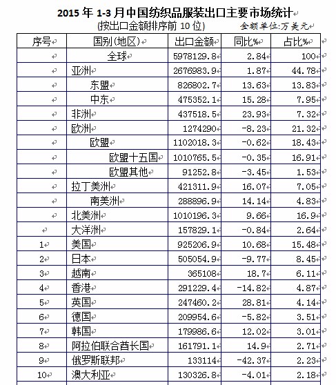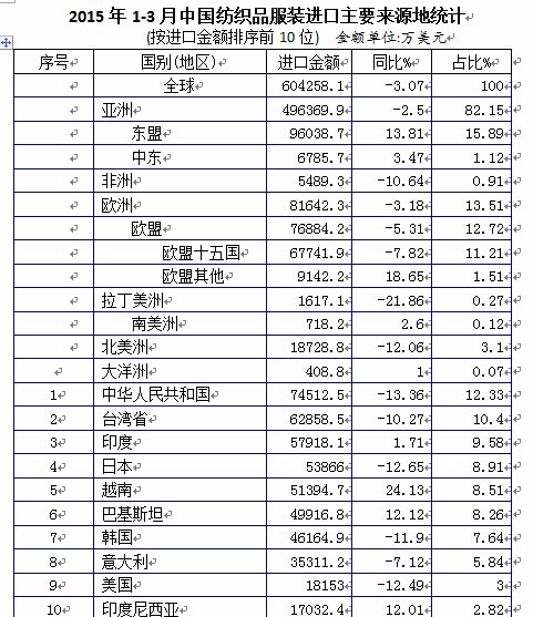 錦橋紡織網(wǎng)—資訊頻道> 外貿(mào)信息>正文 2015年1-3月中國紡織品服裝進(jìn)出口主要來源地統(tǒng)計(jì)
