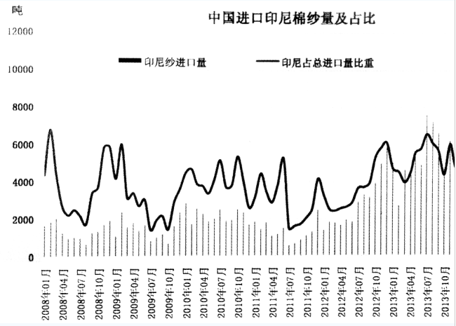 下圖所見,2012年下半年開始,中國對(duì)印尼的紗線進(jìn)口顯著增加,月均進(jìn)口量從之前的1000-2000噸快速增加到6000噸以上,2014年8月的進(jìn)口量突破了1萬噸。2014年全年,中國進(jìn)口印尼棉紗9.3萬噸,同比增長45.8%。同時(shí),印尼占中國紗線進(jìn)口的比重同步提高。2013年開始,印尼占中國棉紗進(jìn)口的比重從不到3%提高到5-6%。