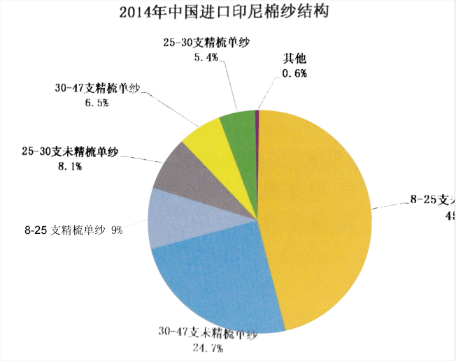 下圖所示,中國進(jìn)口印尼紗的結(jié)構(gòu)如下:8-25支普梳紗占45.7%,30-47支普梳紗占24.7%,8-25支精梳單紗占9%,25-30支普梳紗占8.1%。