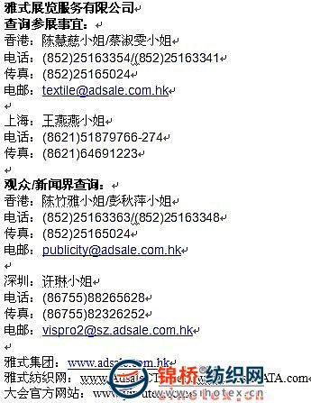 2009年11月18-20日 浙江省•義烏市•義烏國際博覽中心 2009年11月5日 盡管全球金融危機(jī)威脅仍在,對紡織服裝產(chǎn)品需求依然疲弱,但是一枝獨(dú)秀的中國經(jīng)濟(jì)帶來的發(fā)展機(jī)會還是讓全球紡織業(yè)為之心動。海內(nèi)外紡織企業(yè)比以往更關(guān)注國內(nèi)的市場及行業(yè)動向,而行業(yè)內(nèi)知名的展會便順理成章成為行業(yè)內(nèi)的風(fēng)向標(biāo)。 作為全國首個(gè)通過UFI國際認(rèn)可的針織及襪子工業(yè)展會——「中國(義烏)國際祙子、針織及染整機(jī)械展覽會」(以下簡稱“YiwuH&G”),受惠于中國經(jīng)濟(jì)回暖及在過往10年豐富辦展經(jīng)驗(yàn)的基礎(chǔ)上,再次獲得行業(yè)的認(rèn)同。展會得到眾多知名企業(yè)的大力支持,海內(nèi)外著名廠商選擇YiwuH&G作為他們展示最新產(chǎn)品和最先進(jìn)技術(shù)的平臺,今屆展會預(yù)計(jì)將有130家展商參與,200多臺機(jī)械將于現(xiàn)場演示。 現(xiàn)時(shí)所有展商已落實(shí)展位,新老展商踴躍參與,反應(yīng)理想,預(yù)計(jì)展出面積達(dá)9000平方米。最新落實(shí)展位的企業(yè)包括:韓國的諸暨三德、諸暨致遠(yuǎn)、諸暨雙行、諸暨宇翔、香港崇美、恒美針織配件、遠(yuǎn)大針織機(jī)械、華東機(jī)械廠、優(yōu)恩工業(yè)株式會社、太倉東元、泰國的NumrungRayon等。其中泰國的NumrungRayon、諸暨雙行、諸暨宇翔、香港崇美、華東機(jī)械廠更是首次參與展出。部份參與的展商分類如下: 針織、織襪機(jī)械及零配件 奧鑼拉、寶源、CesareColosio、香港中大、大康織襪、意大利羅納地、德國格羅茨、泉州匯成、意大利勝歌、紹興金昊、華技、東陽創(chuàng)億、無錫中盛、日本源井、浙江葉曉、意大利愛吉爾、上?;?、史陶比爾、上海瑞紡、WillCorporation、Comoli、新昌振興、合肥遠(yuǎn)大、臺灣鈦鉿興、廣州星雅、諸暨豐足、日昌針織、潤源等 印染整理設(shè)備 韓國阿羅美申益、大連巴藤、CorteseEologna、Cubotex、Heliot、廣州星雅、廣州霏鴻、景大等 織帶、經(jīng)編機(jī)、提花及拉鏈成型機(jī)械 瑞士約科布.繆勒、泉州匯成、廣野、潤源、誠鑫等 無縫內(nèi)衣機(jī)械 意大利圣東尼、紹興金昊、邁埤集團(tuán)、泉州凹凸機(jī)械、上海珩森、寧波慈星、鈺誠機(jī)械、金天梭、日發(fā)等 紗線、纖維、花邊及零配件 太倉克恩-里伯斯、日本源井、Numrung、三星織針、海潤精工、恒美、蘭寶等 手套編織機(jī)械及其它 萬事興、佳仕峰、ICE等 “第十屆中國(義烏)國際襪子、針織及染整機(jī)械展覽會”和“第三屆中國(義烏)國際織帶及服裝機(jī)械展覽會”由中國國際貿(mào)易促進(jìn)委員會浙江省分會、浙江中國小商品城集團(tuán)股份有限公司、雅式展覽服務(wù)有限公司攜手主辦;浙江義烏中國小商品城展覽有限公司、中國小商品城梅湖會展中心、浙江省國際貿(mào)易展覽有限公司承辦;同時(shí)亦得到上海內(nèi)衣行業(yè)協(xié)會、中國國際商會義烏市商會、義烏市襪業(yè)行業(yè)協(xié)會、義烏市線帶行業(yè)協(xié)會、義烏市拉鏈行業(yè)協(xié)會、義烏市無縫織造行業(yè)協(xié)會、義烏市服裝行業(yè)協(xié)會、義烏市手套行業(yè)協(xié)會、浦江縣針織印染業(yè)協(xié)會等實(shí)力雄厚單位支持。 更多展會詳情,請瀏覽展會網(wǎng)站:www.yiwutex.com或與雅式展覽服務(wù)有限公司聯(lián)系
