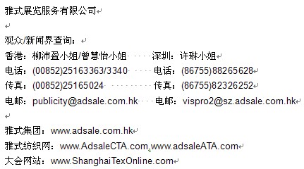 有關展商和展會的更詳細情況,請瀏覽大會指定信息網(wǎng)www.ShanghaiTexOnline.com。