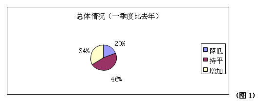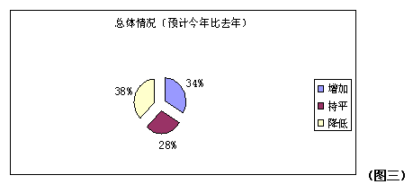 第一個(gè)問題是關(guān)于企業(yè)總體經(jīng)營狀況的調(diào)查。從圖一可以明顯的看出2013年一季度實(shí)際銷售情況與去年同期相比,46%的企業(yè)表示總體情況是持平的,20%的企業(yè)表示他們的銷售額相比同期有所降低,只有34%的企業(yè)的營業(yè)額增加了。同時(shí)在即將到來的二季度,如圖二所示45%的企業(yè)認(rèn)為他們的銷售額不會(huì)有改變,19%的企業(yè)認(rèn)為銷售額會(huì)降低。受訪企業(yè)對于2013年全年的銷售預(yù)期信心明顯增強(qiáng),34%的企業(yè)認(rèn)為他們的銷售額相比2012年是會(huì)增加的,但是也有38%的企業(yè)認(rèn)為13年的企業(yè)經(jīng)營情況會(huì)比12年差。