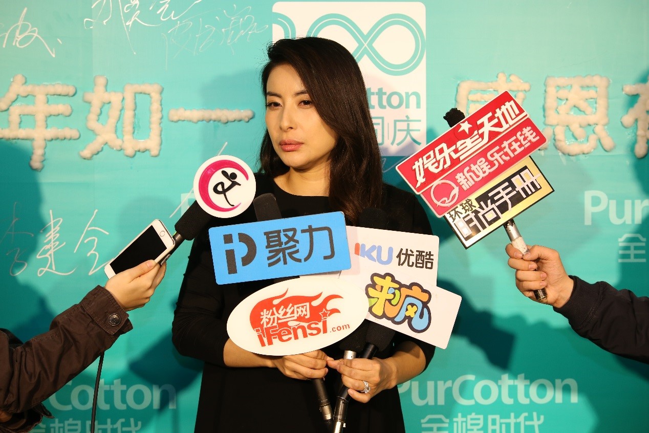 郭晶晶在全棉時代七年百店慶典現(xiàn)場接受采訪