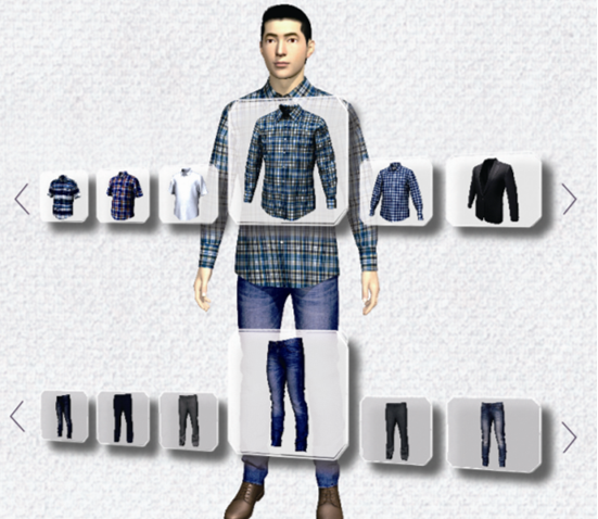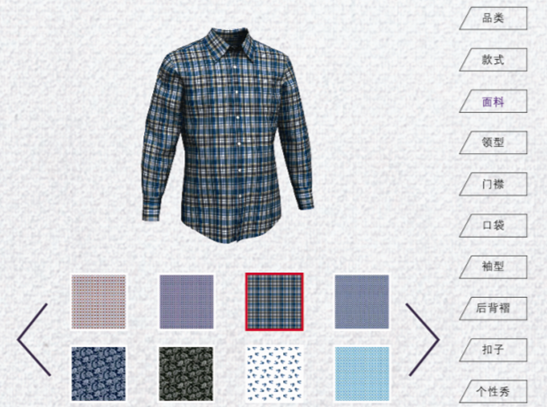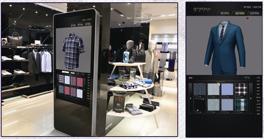 2.海量虛擬樣衣,節(jié)約成本。顧客在試衣機上選擇扣位,面料,衩位,口袋等,成衣效果立即出現(xiàn),選擇變得直觀,高效,無風(fēng)險。