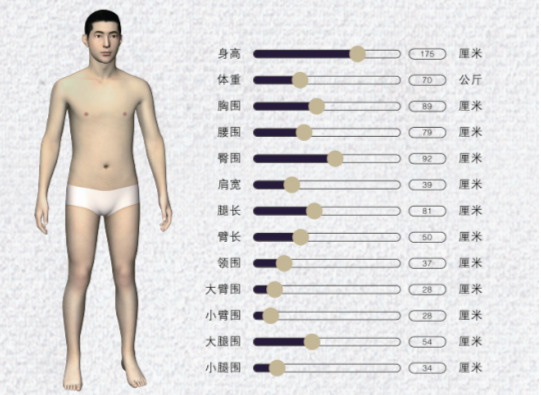 1.顧客可以看見1:1等高的3D虛擬的自己。量體師輸入顧客身材參數(shù),即可生成3D虛擬形象,頭像和膚色也可通過照片獲得。如果與3D掃描儀相連,身材數(shù)據(jù)將自動導(dǎo)入。