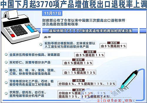 2008年12月1日起繼續(xù)提高部分勞動密集型產(chǎn)品、機(jī)電產(chǎn)品及其他產(chǎn)品增值稅出口退稅率 國務(wù)院總理溫家寶 12 日主持召開國務(wù)院常務(wù)會議。會議決定,為扶持勞動密集型中小企業(yè),支持產(chǎn)業(yè)優(yōu)化升級,在今年下半年兩次提高出口退稅率的基礎(chǔ)上,自 2008 年 12 月 1 日,進(jìn)一步提高部分勞動密集型產(chǎn)品、機(jī)電產(chǎn)品和其他受影響較大產(chǎn)品