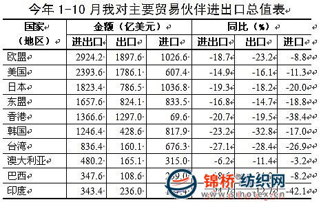 六、主要的7個省市對外貿(mào)易合計占8成以上 2009年1-10月廣東省外貿(mào)進(jìn)出口總值位列全國第一,進(jìn)出口總值4821.9億美元,同比下降16.8%,占同期全國進(jìn)出口總值的27.5%。同期江蘇省、上海市、北京市(含中央在京單位)進(jìn)出口值分別2711.7億美元、2207.8億美元、1713.4億美元,分別下降19.8%、19.8%、27.8%。此外浙江省、山東省、福建省進(jìn)出口值分別1525.4億美元、1121.7億美元、640.4億美元,分別下降15.9%、16.7%、11.6%。上述7省市進(jìn)出口值合計占同期全國進(jìn)出口總值的84%。 從出口方面來看,1-10月廣東省出口2842.5億美元,同比下降16.2%,小于同期總體降幅4.3個百分點。江蘇和上海分別出口1594.3億美元和1131.9億美元,同比分別下降21.2%和20.7%,分別大于同期全國出口總體降幅0.7個和0.2個百分點。此外浙江、山東、福建、北京分別出口1081.1億、639億、428.9億、388.5億美元,分別下降17.7%、18.1%、10.8%、18.9%。 七、主要勞動密集型產(chǎn)品出口降幅普遍較小,鋼材和肥料等出口下降明顯 2009年1-10月我國主要勞動密集型產(chǎn)品出口同比降幅均小于同期總體出口降幅20.5%的水平,其中服裝及衣著附件出口879億美元,下降10.9%;紡織紗線及織物483.9億美元,下降12.9%;鞋類230.5億美元,下降6%;家具198億美元,下降8.4%;塑料制品114.8億美元,下降8.4%;箱包102億美元,下降10.2%;玩具65.2億美元,下降11.3%。同期我國機電產(chǎn)品出口5646.4億美元,同比下降18.6%,占同期我國出口總值的59%。其中電器及電子產(chǎn)品出口2367.2億美元,下降18.1%;機械設(shè)備1874.4億美元,下降17%。此外,糧食268萬噸,下降16.8%;肥料690萬噸,下降27.2%;鋼材1841萬噸,下降65.3%。 八、主要大宗商品進(jìn)口量均有不同程度的增長,鋼材進(jìn)口小幅增長 2009年1-10月我國進(jìn)口初級產(chǎn)品2272.1億美元,同比下降29.4%,占同期我國進(jìn)口總值的28.5%。主要大宗商品進(jìn)口量均有不同程度增長,其中鐵礦砂進(jìn)口5.1億噸,增長36.8%,進(jìn)口均價每噸78.4美元,下跌45%;原油1.7億噸,增長9.4%,進(jìn)口均價每噸412.8美元,下跌46.5%;大豆3488萬噸,增長13.2%,進(jìn)口均價每噸438.1美元,下跌27.9%;初級形狀的塑料1976萬噸,增長30.6%,進(jìn)口均價每噸1420.7美元,下跌28.5%;煤進(jìn)口9687萬噸,增長1.7倍,進(jìn)口均價每噸83.9美元,與去年同期持平;未鍛造銅及銅材363萬噸,增長70.2%,進(jìn)口均價每噸4985.8美元,下跌36.4%;未鍛造鋁及鋁材208.4萬噸,增長1.8倍,進(jìn)口均價每噸2202.7美元,下跌48.9%。此外進(jìn)口成品油3127萬噸,下降6.6%,進(jìn)口均價每噸436.6美元,下跌47.6%。同期進(jìn)口工業(yè)制品5709.2億美元,同比下降14%。其中機電產(chǎn)品進(jìn)口3890億美元,下降15.8%;化學(xué)成品及有關(guān)產(chǎn)品903.8億美元,下降13.7%;汽車30.5萬輛,下降10.6%;鋼材1486萬噸,增長10.3%。(綜合統(tǒng)計司) |