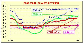 3月份我國CPI同比上漲5.4%,創(chuàng)32個月來新高。其中食品類上漲11.7%;居住上漲6.6%,衣著漲0.8%。