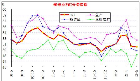 2012年6月,中國(guó)制造業(yè)采購(gòu)經(jīng)理指數(shù)(PMI)為50.2%,比上月回落0.2個(gè)百分點(diǎn)。 分企業(yè)規(guī)???,大型企業(yè)PMI為50.6%,比上月回落0.5個(gè)百分點(diǎn),繼續(xù)位于臨界點(diǎn)以上;中型企業(yè)PMI為50.0%,位于臨界點(diǎn);小型企業(yè)PMI為47.2%,連續(xù)3個(gè)月位于臨界點(diǎn)以下。