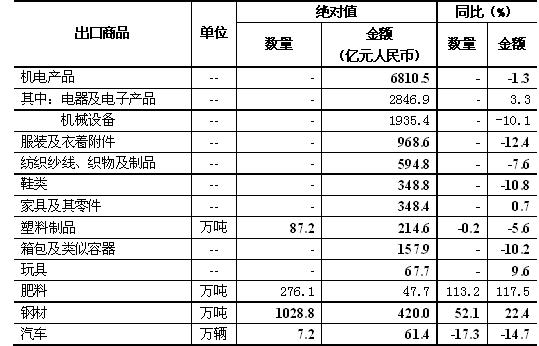 五、機電產(chǎn)品和傳統(tǒng)勞動密集型產(chǎn)品出口均有所下降。1月,我國機電產(chǎn)品出口6810.5億元,下降1.3%,占出口總值的55.5%。其中,電器及電子產(chǎn)品出口2846.9億元,增長3.3%;機械設(shè)備1935.4億元,下降10.1%。同期,服裝出口968.6億元,下降12.4%;紡織品594.8億元,下降7.6%;鞋類348.8億元,下降10.8%;家具348.4億元,增長0.7%;塑料制品214.6億元,下降5.6%;箱包157.9億元,下降10.2%;玩具67.7億元,增長9.6%;上述7大類勞動密集型產(chǎn)品合計出口2700.8億元,下降8.4%,占出口總值的22%。此外,肥料出口276萬噸,增加1.1倍;鋼材1028.8萬噸,增加52.1%;汽車7.2萬輛,減少17.3%(表2)。
