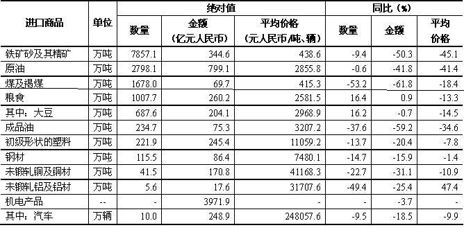 此外,進口糧食1007.7萬噸,增加16.4%;其中大豆687.6萬噸,增加16.2%,進口均價為每噸2969元,下跌14.5%。機電產(chǎn)品進口3971.9億元,下降3.7%;其中汽車10萬輛,減少9.5%(表3)。