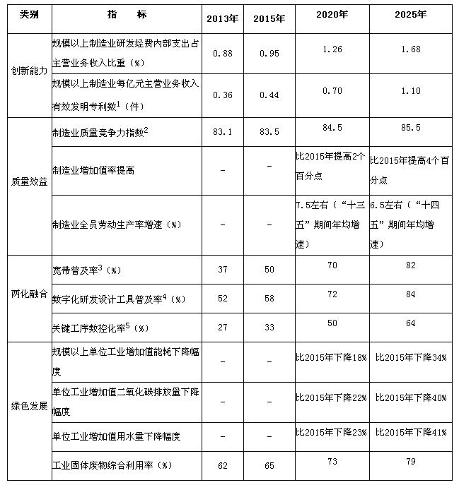 到2025年,制造業(yè)整體素質(zhì)大幅提升,創(chuàng)新能力顯著增強(qiáng),全員勞動(dòng)生產(chǎn)率明顯提高,兩化(工業(yè)化和信息化)融合邁上新臺(tái)階。重點(diǎn)行業(yè)單位工業(yè)增加值能耗、物耗及污染物排放達(dá)到世界先進(jìn)水平。形成一批具有較強(qiáng)國際競爭力的跨國公司和產(chǎn)業(yè)集群,在全球產(chǎn)業(yè)分工和價(jià)值鏈中的地位明顯提升。