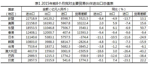 二、對美國、東盟出口保持增長,對歐盟、日本出口下降。前8個月,歐盟為我國第一大貿易伙伴,中歐貿易總值2.27萬億元,下降8.4%,占我外貿總值的14.5%。其中,我對歐盟出口1.41萬億元,下降4.9%;自歐盟進口8598.7億元,下降13.7%;對歐貿易順差5521.5億元,擴大13.1%。美國為我國第二大貿易伙伴,中美貿易總值為2.22萬億元,增長2%,占我外貿總值的14.1%。其中,我對美國出口1.62萬億元,增長5.9%;自美國進口5967.8億元,下降7.4%;對美貿易順差1.02萬億元,擴大15.6%。