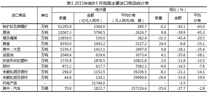 六、原油、糧食、成品油等主要大宗商品進口量增加,主要進口商品價格普遍下跌。前8個月,我國進口鐵礦砂6.13億噸,微降0.2%,進口均價為每噸385.7元,下跌43%;原油2.21億噸,增加9.8%,進口均價為每噸2626.7元,下跌45.3%;煤1.39億噸,減少31.3%,進口均價為每噸382.4元,下跌20.5%;成品油2048.6萬噸,增加4.1%,進口均價為每噸3073.4元,下跌38.1%;初級形狀的塑料1735.8萬噸,增加2%,進口均價為每噸1.08萬元,下跌13.5%;鋼材872.2萬噸,減少9.6%,進口均價為每噸7082.3元,下跌7.6%;未鍛軋銅及銅材294萬噸,減少8.1%,進口均價為每噸3.92萬元,下跌14.1%。