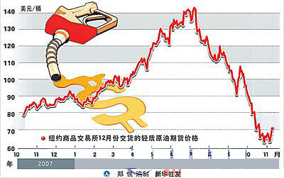 國際油價1年來走勢,從每桶140多美元降至60-70美元,僅用不到4個月時間。 由于全球經(jīng)濟衰退導(dǎo)致能源需求持續(xù)下降,國際油價10月20日創(chuàng)下3年半來新低,紐約市場油價跌破每桶50美元。 當(dāng)天紐約商品交易所12月份交貨的輕質(zhì)原油期貨價格下跌4美元,收于每桶49.62美元,是自2005年5月以來最低水平。倫敦國際石油交易所1月份交貨