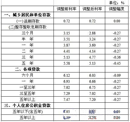 中國人民銀行決定,從2008年10月30日起下調(diào)金融機(jī)構(gòu)人民幣存貸款基準(zhǔn)利率,一年期存款基準(zhǔn)利率由現(xiàn)行的3.87%下調(diào)至3.60%,下調(diào)0.27個百分點;一年期貸款基準(zhǔn)利率由現(xiàn)行的6.93%下調(diào)至6.66%,下調(diào)0.27個百分點;其他各檔次存、貸款基準(zhǔn)利率相應(yīng)調(diào)整。個人住房公積金貸款利率保持不變。 金融機(jī)構(gòu)人民幣存貸款基準(zhǔn)利率調(diào)整表
