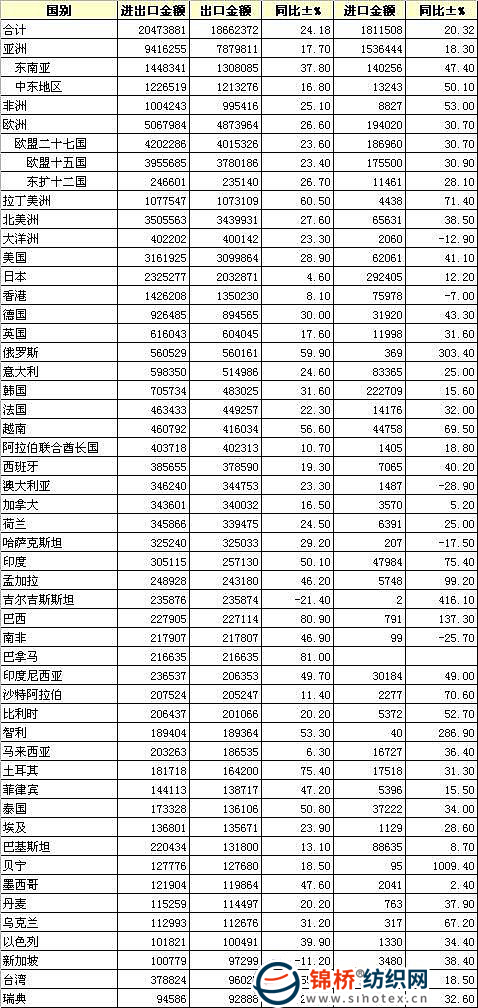 錦橋紡織網(wǎng)—資訊頻道> 統(tǒng)計資料>正文 2010年1-11月我國紡織品服裝進出口國別統(tǒng)計