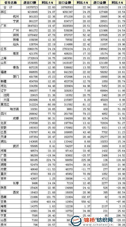 錦橋紡織網(wǎng)—資訊頻道> 統(tǒng)計(jì)資料>正文 2010年1-10月全國(guó)紡織服裝進(jìn)出口分省市統(tǒng)計(jì)