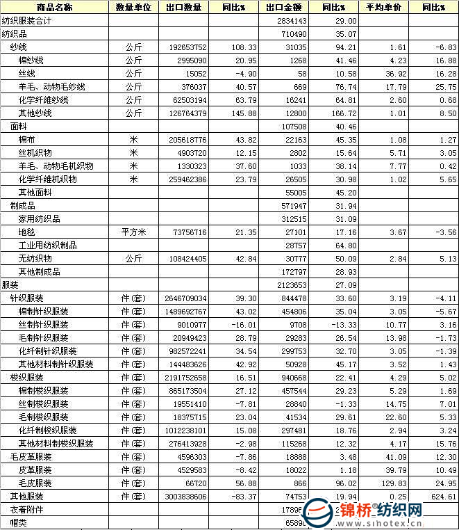 錦橋紡織網(wǎng)—資訊頻道> 統(tǒng)計資料>正文 2010年1-10月我國對美國出口紡織品服裝統(tǒng)計