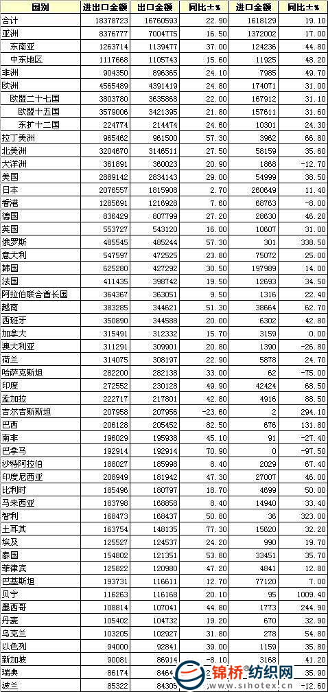錦橋紡織網(wǎng)—資訊頻道> 統(tǒng)計(jì)資料>正文 2010年1-10月我國(guó)紡織品服裝進(jìn)出口國(guó)別統(tǒng)計(jì)