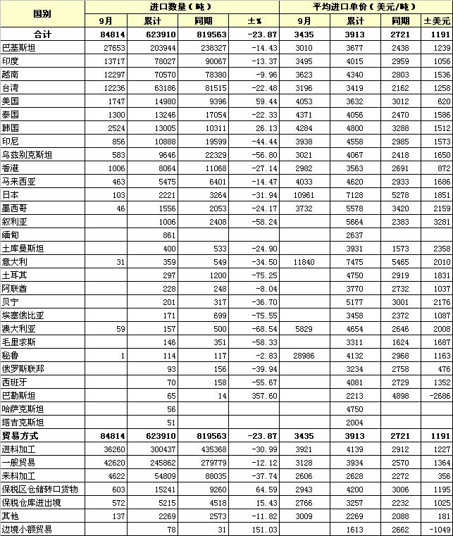 錦橋紡織網(wǎng)—資訊頻道> 統(tǒng)計(jì)資料>正文 2011年9月我國棉紗線進(jìn)口貿(mào)易方式及主要來源國別統(tǒng)計(jì)
