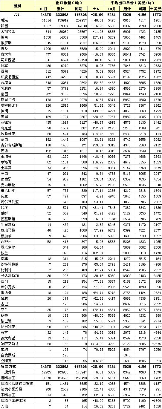 錦橋紡織網(wǎng)—資訊頻道> 統(tǒng)計(jì)資料>正文 2011年10月我國(guó)棉紗線出口貿(mào)易方式及主要國(guó)別統(tǒng)計(jì)
