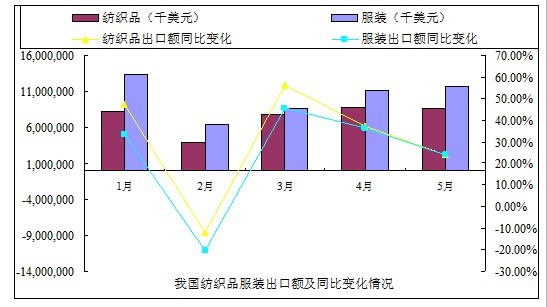 2011年5月,我國(guó)出口紡織紗線及織物86.19億美元,出口服裝及衣著附件117.19億美元,分別比4月增長(zhǎng)了-1.7%、5.5%,2011年1~5月,紡織紗線及織物,服裝及衣著附件出口額比2010年同期增長(zhǎng)31.5%、23.1%。