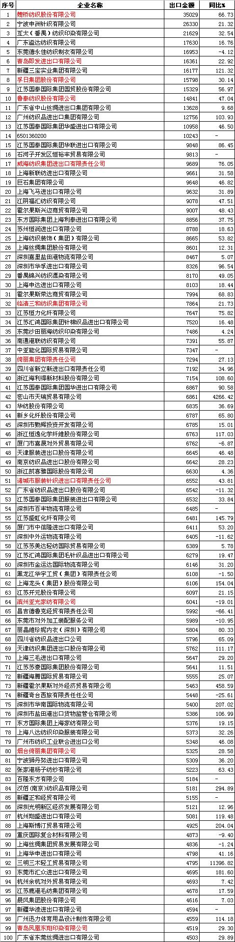2011年1-4月中國紡織品服裝出口企業(yè)排名
