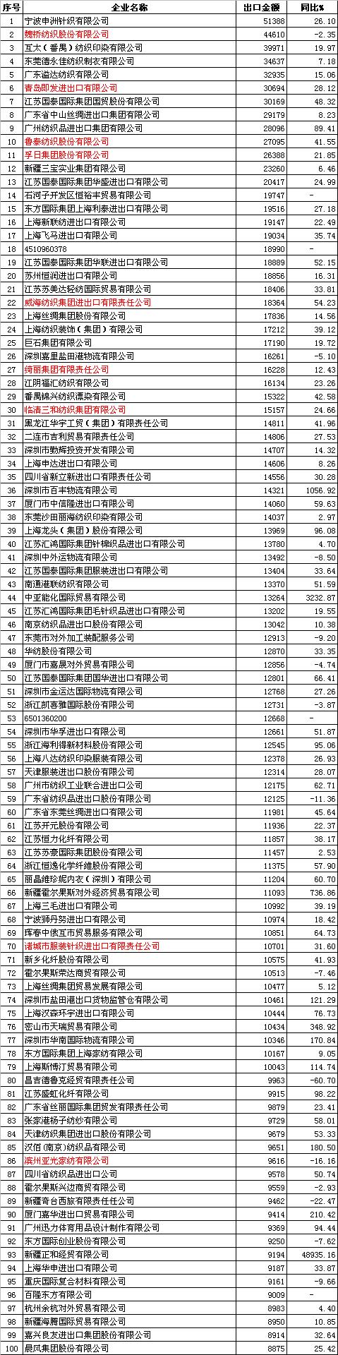 2011年1-7月中國紡織品服裝出口企業(yè)排名
