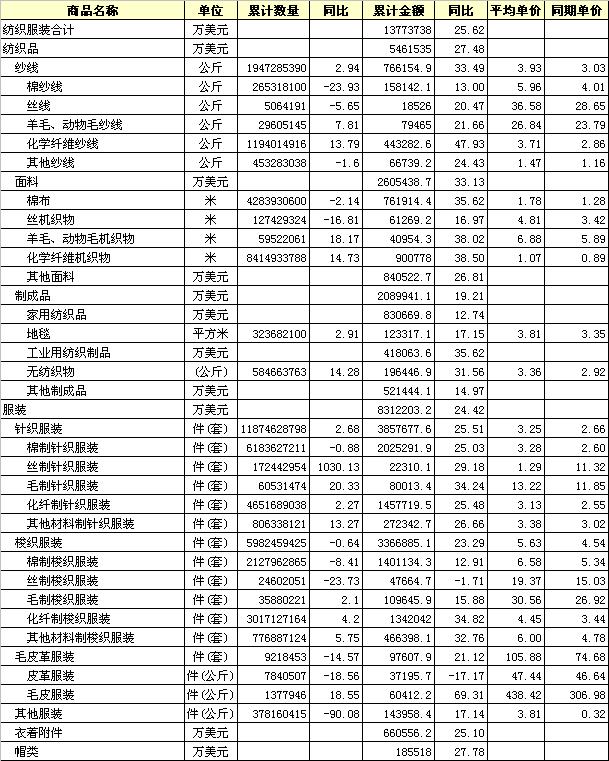2011年1-7月全國紡織服裝出口產(chǎn)品統(tǒng)計