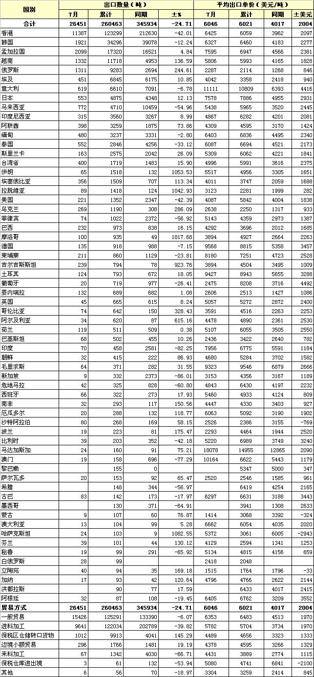 錦橋紡織網(wǎng)—資訊頻道> 統(tǒng)計資料>正文 2011年7月我國棉紗線出口貿(mào)易方式及主要國別統(tǒng)計
